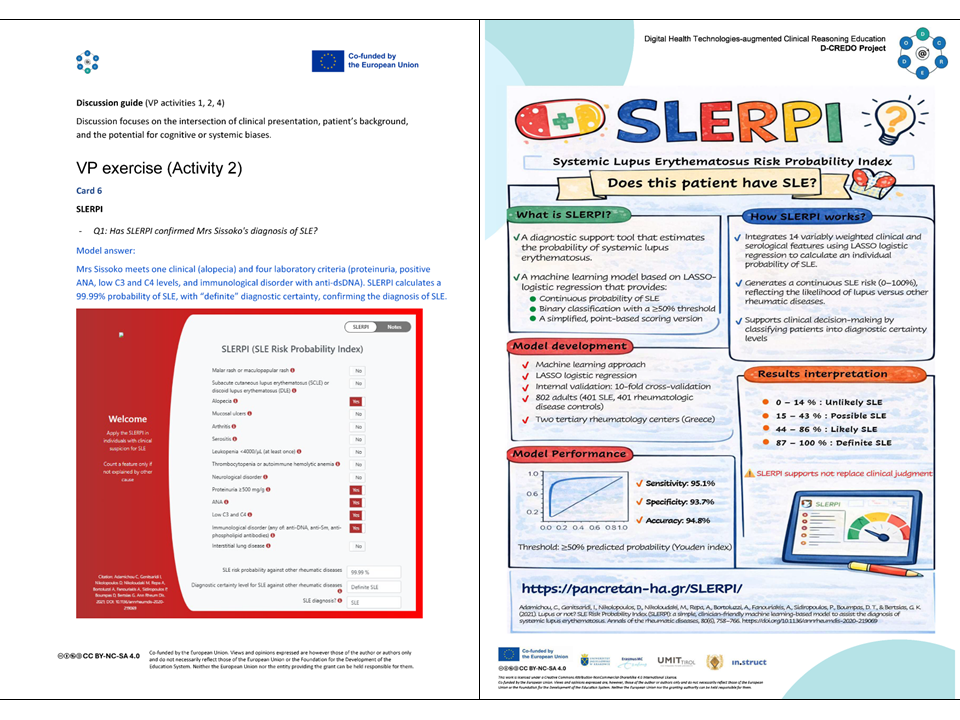 Finally, we aimed to ensure that all digital tools integrated into the virtual patient experience were freely accessible. Through an extensive literature review on the use of AI in SLE, we identified publicly available machine learning models, such as SLERPI, as well as open datasets published alongside academic articles. These resources were incorporated into the learning unit as practical, hands-on examples, allowing students to move beyond theory and engage directly with real tools.